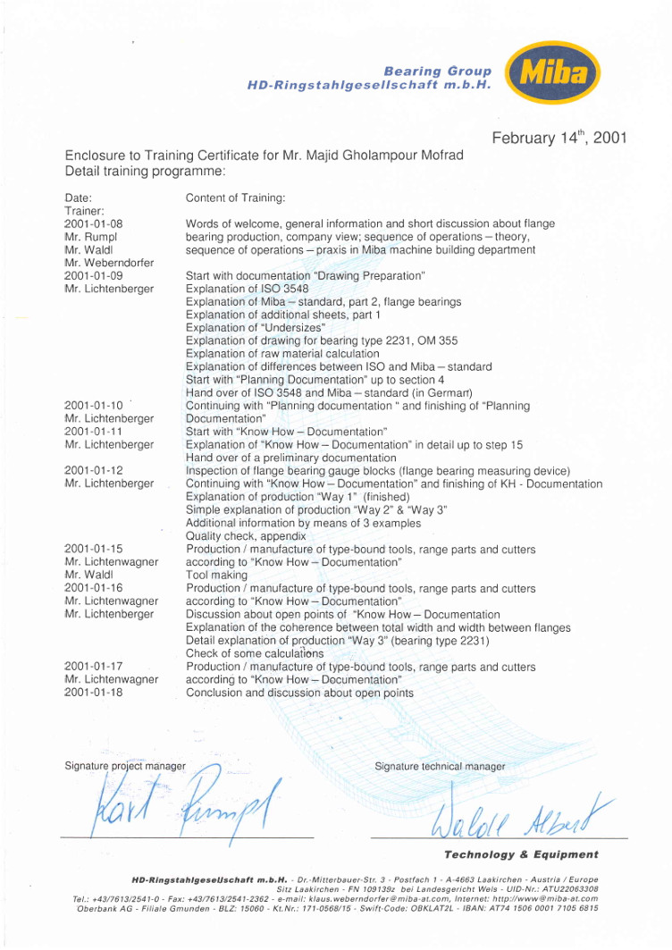 حضور در دوره های رسمی آموزشی کامل در شرکت Miba کشور اتریش در خصوص طراحی مهندسی تولید و کنترل کیفیت انواع یاتاقان با روشهای تولیدی مختلف این شرکت یکی از صاحب نام ترینهای این صنعت در دنیاست Miba در چند کشور از جمله آمریکا به تولید انواع یاتاقانهای پیشرو برای بزرگترین سازندگان موتور توربین، کمپرسور ژنراتور گیربکس و …. مشغول است و از شرکت هایی است که این تکنولوژی را در دنیا توسعه می دهد.